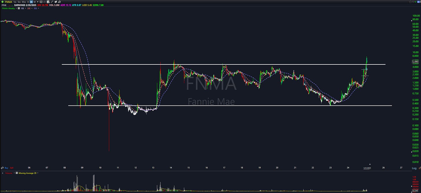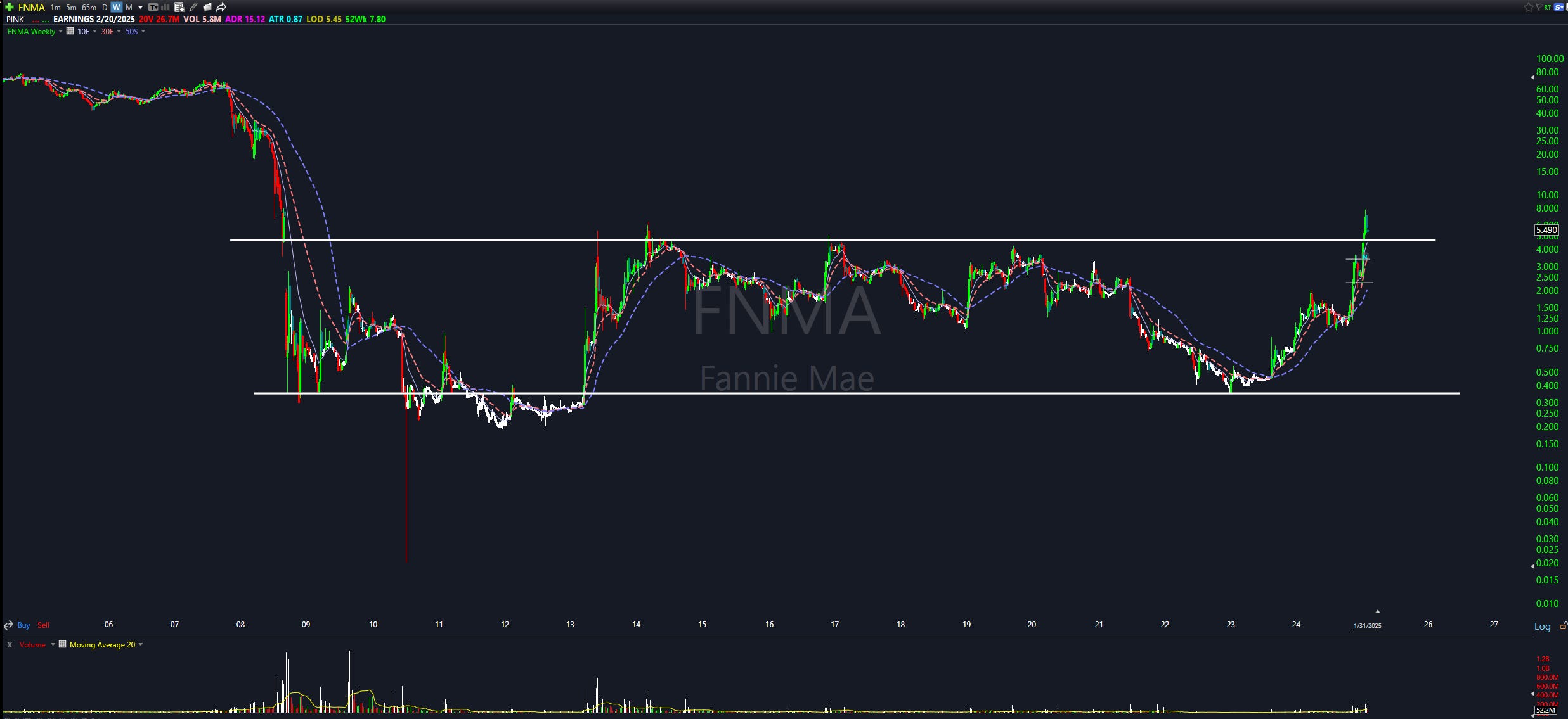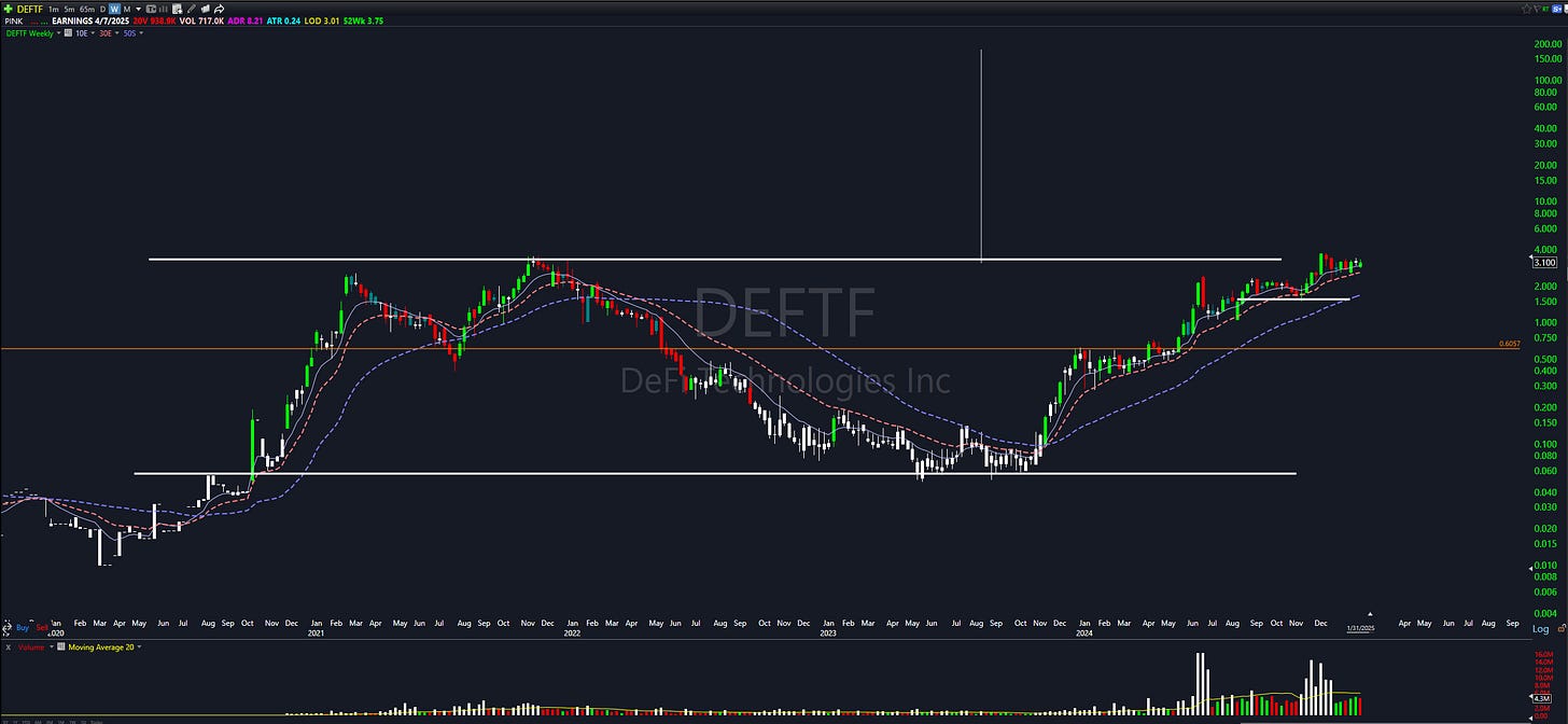 Honestly this is probably one of the best risk to reward investments because it is breaking a multi year base. We currently have 2 inside weeks, but we may test the 10 WMA or the the Thick Horizontal trendline. If it pulls back to 4.5 then that would be a really good entry. This is an OTC stock so there are no stops.