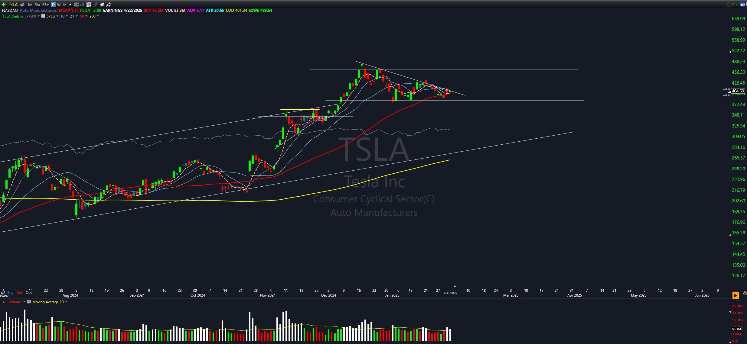 Highest volume candle with a huge weekly downtrend break. Consolidating at the 10 SMA with a possible inverse head and shoulders on the 65 minute.